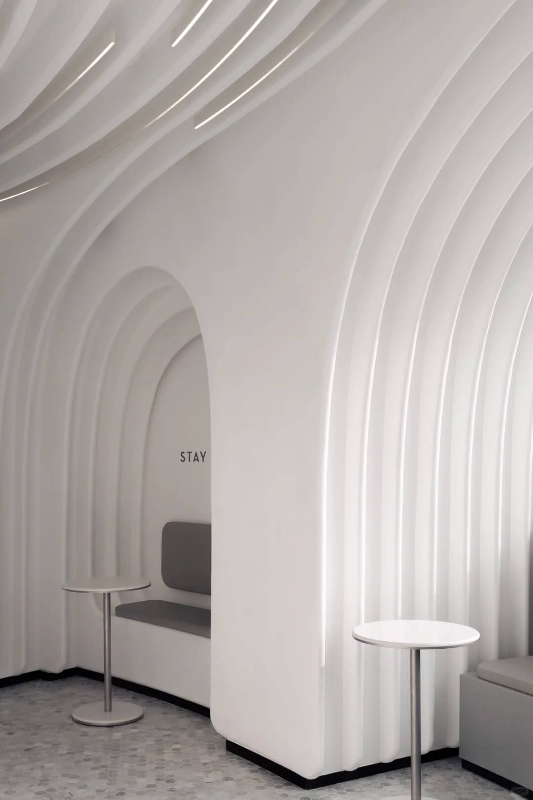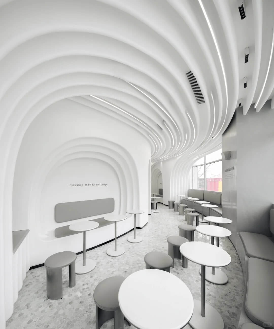Bước vào bên trong, không gian trắng tinh khôi, ánh sáng dịu nhẹ và những đường cong mềm mại trên trần
