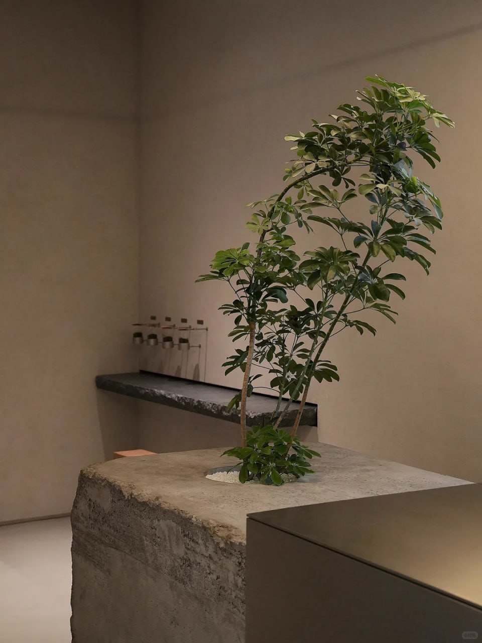 Ngay lối vào, mảng cây xanh mọc lên từ nền đá, biểu trưng cho sức sống và sự hòa hợp với thiên nhiên