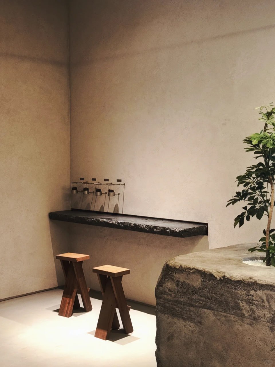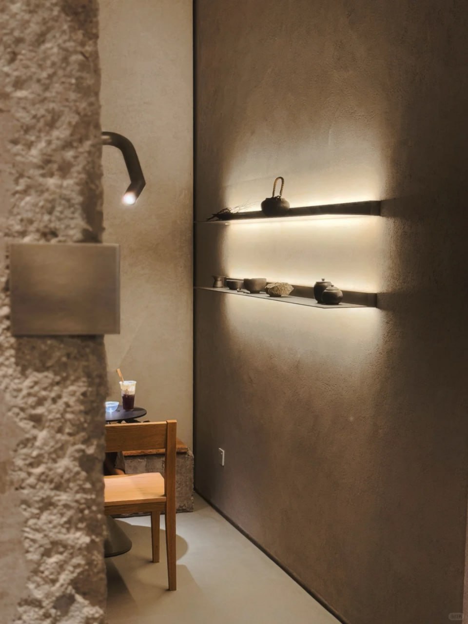 Không gian được xây dựng trên nền chất liệu bê tông mộc, kết hợp cùng gỗ tự nhiên và ánh sáng dịu, tạo nên